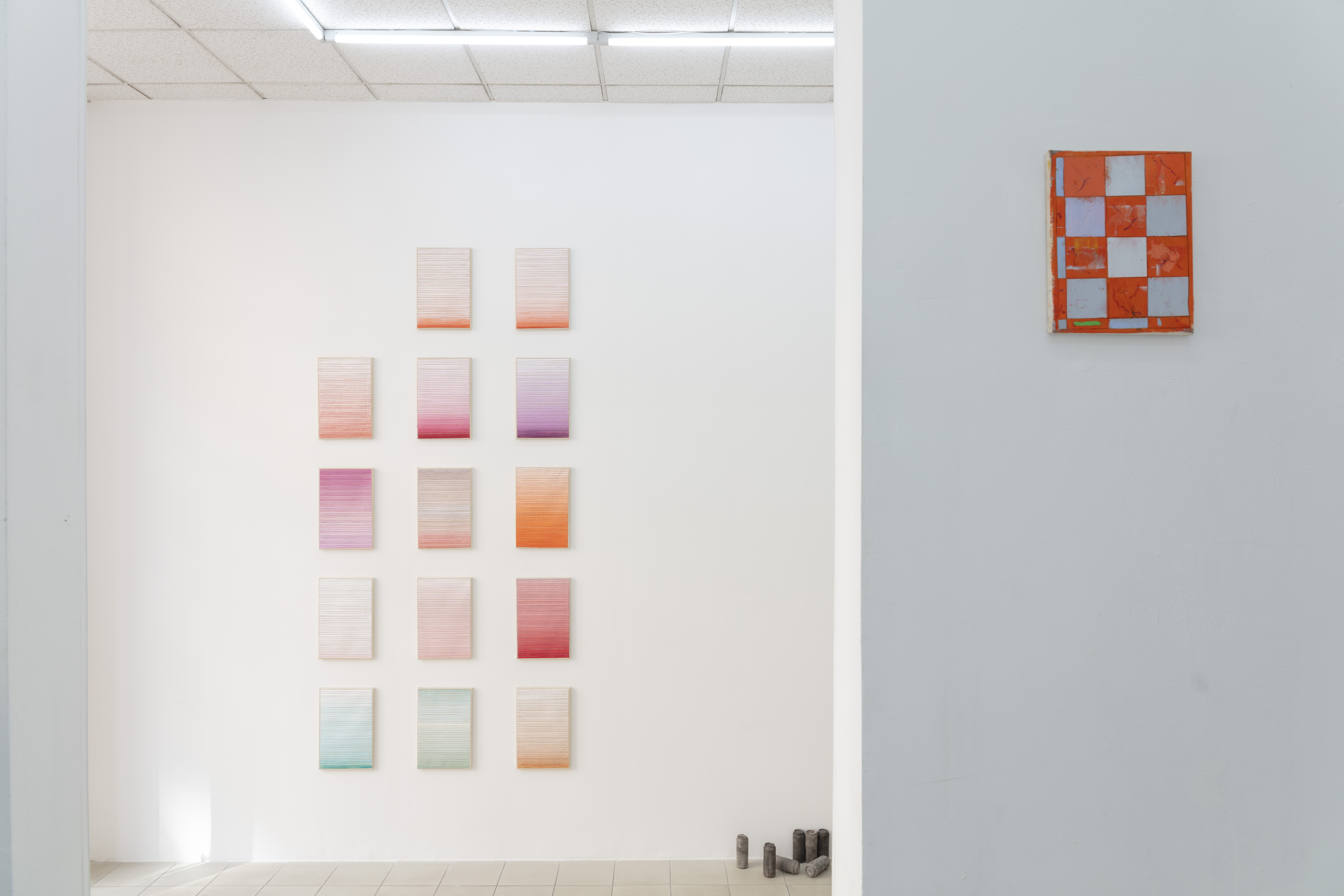 Nach flatness im delirium (2022) und filled in (2023) kommt pure reservoir: In Daniel Hörners zweiter Solo Show bei Nina Mielcarczyk geht es um Erinnerungen, eingekocht und abgegossen, angedeutet und eingeritzt. Ein Speicher von Andenken, ein Behälter für Assoziationen, ein Reservoir. Wenn du ein Raum wärst, welche Farbe hättest du? In Hörners gemalten Streifenbildern werden Wohnzimmer im Vorübergehen zu wohligen Stimmungen, und der romantisierende Blick hinter die vergilbten Rollos aus Urlaubserinnerungen zu horizontal gegliederten Pastellverläufen. Die sortierten Farbfelder: das softeste Stakkato. Wortwörtlich, denn das Wachs trocknet nie ganz. In gestreiftem Flimmern fängt Hörner die lauen Temperaturen des Wohnens wachsfarben ein. Eine Serie wie eine fragmentarische Fassade aus Ideen, flirrend und bunt. Gegenüber den unordentlich aufgeräumten Farbverläufen dann auf alleinstehenden Leinwänden krummgefaltete Linienreihen, bedenkenlos geometrisch. Daneben stehen springende Raster, die Felder ausgekreuzt und ausschraffiert, die Linen gestaucht und gestreckt, ein Schachspiel was aufhört, sobald man angefangen hat, ungleiche Chancen ohne Zug- zwang, alle sind matt und niemanden juckt’s. Die Farbe der Malereien, eingekocht aus Wachs, Pigment und Vaseline – die Essenz bleibt übrig – ist als dicke Schicht auf die Leinwand aufgetragen. Darauf Kugelschreiberkerben im immerfeuchten Wachs, Hörners Arbeiten sind Augenblick und Andenken zugleich.