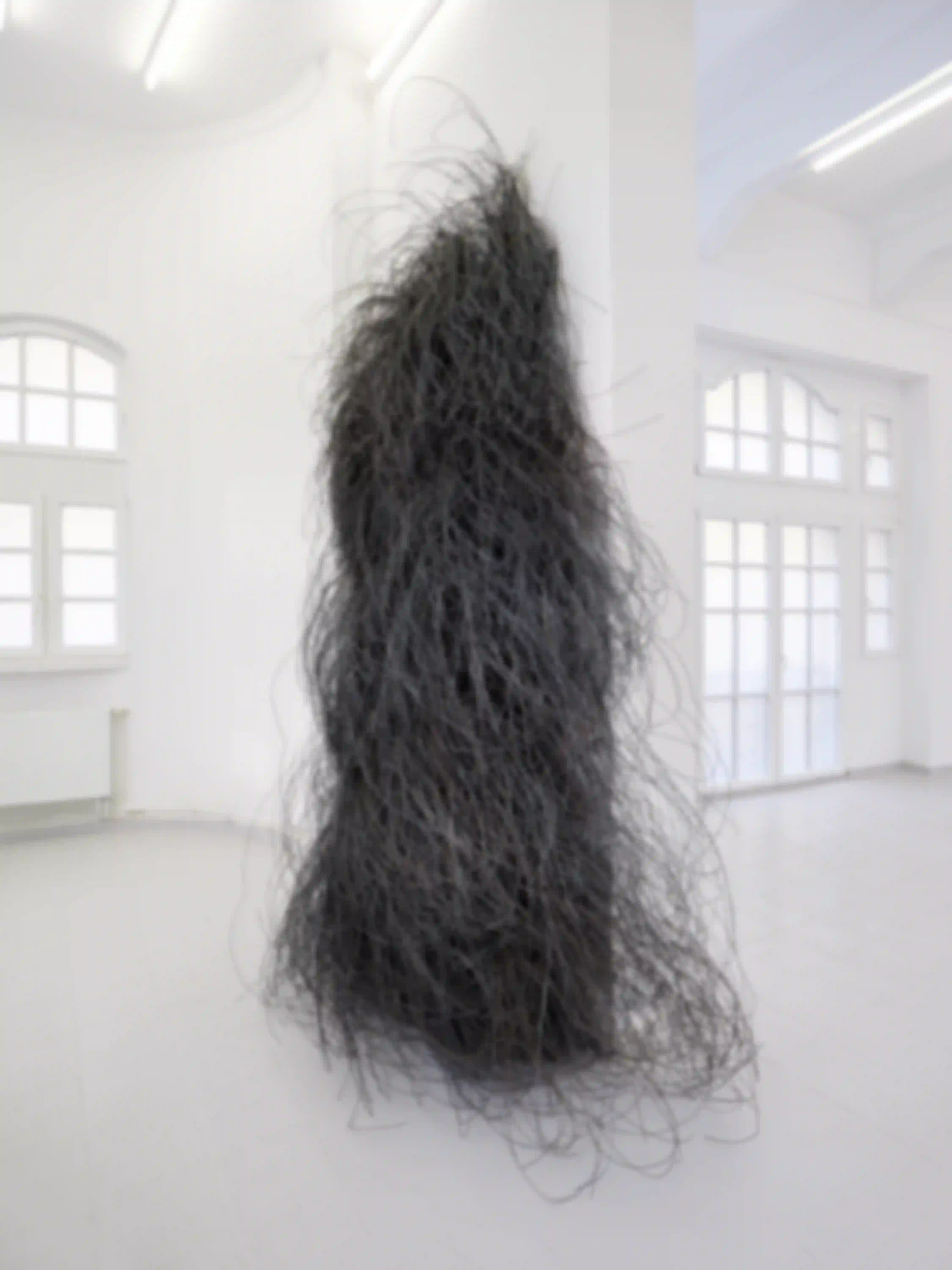 Enne Haehnle (*1963) lebt und arbeitet in Leipzig (DE). Haehnles Werke entstehen zumeist aus freiem Experimentieren heraus. Dabei wird der Prozessualität besonderer Wert beigemessen – die Künstlerin reagiert in ihrer Auseinandersetzung mit dem Werkstoff auf die materialspezifischen Gegebenheiten, sodass der Eigenproduktivität des Materials Raum gegeben wird. Die Widerständigkeit der Substanz verleiht ihr eine eigene Formlogik, auf die Haehnle sich einlässt. Beispielsweise ihre Arbeit mit Magnetband sieht die Künstlerin als Freilassen der Linien, sie verhilft ihnen lediglich dazu, ihre gewählte Form zu entfalten. Auf diese Weise kommt ein kollaborativer Akt zwischen drei Akteur:innen zustande: Haehnles am Objekt sichtbar gemachte Handlungen, den Anforderungen des Ausstellungsortes und den Eigenheiten des Materials, welche an den ersteren beiden spürbar werden.