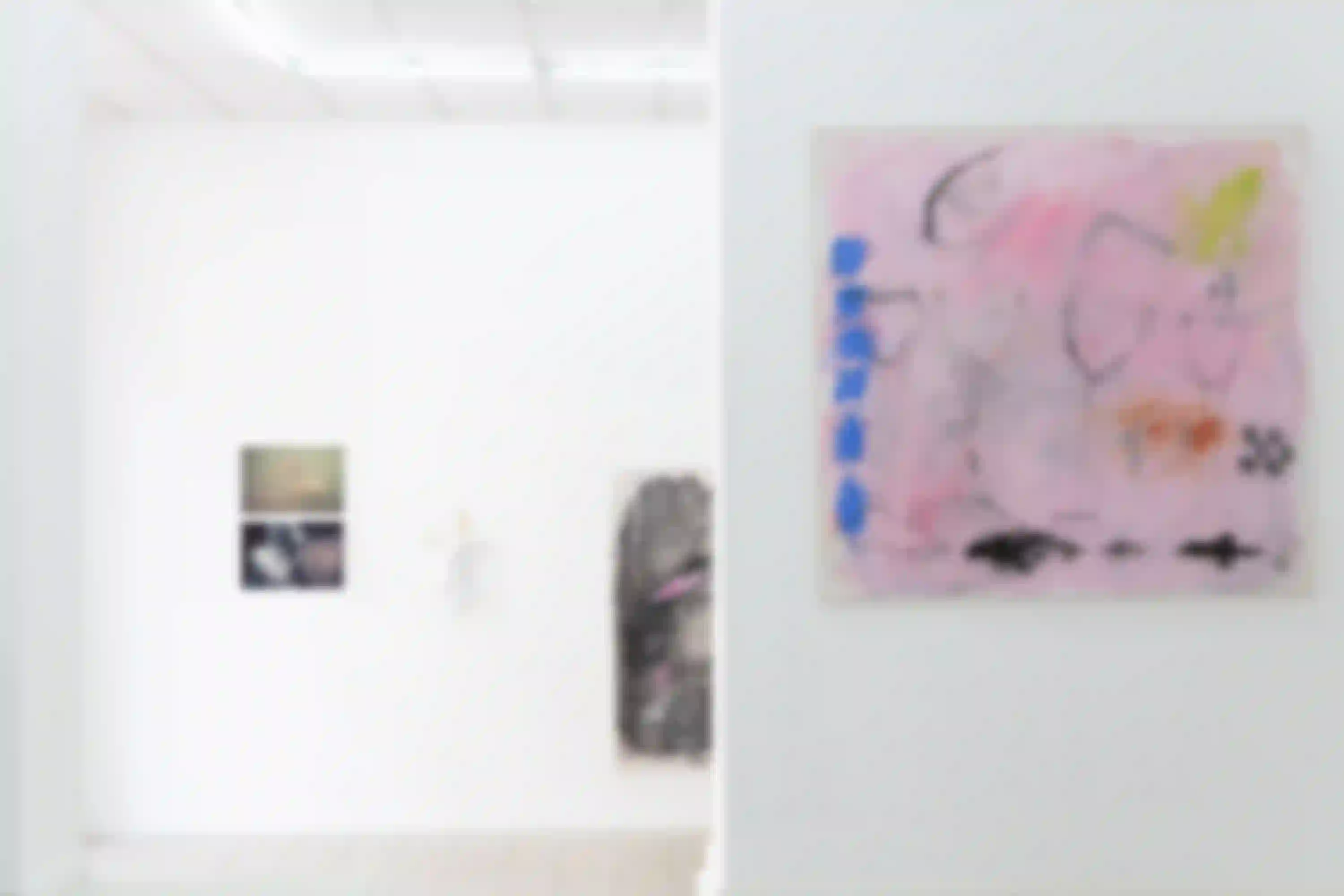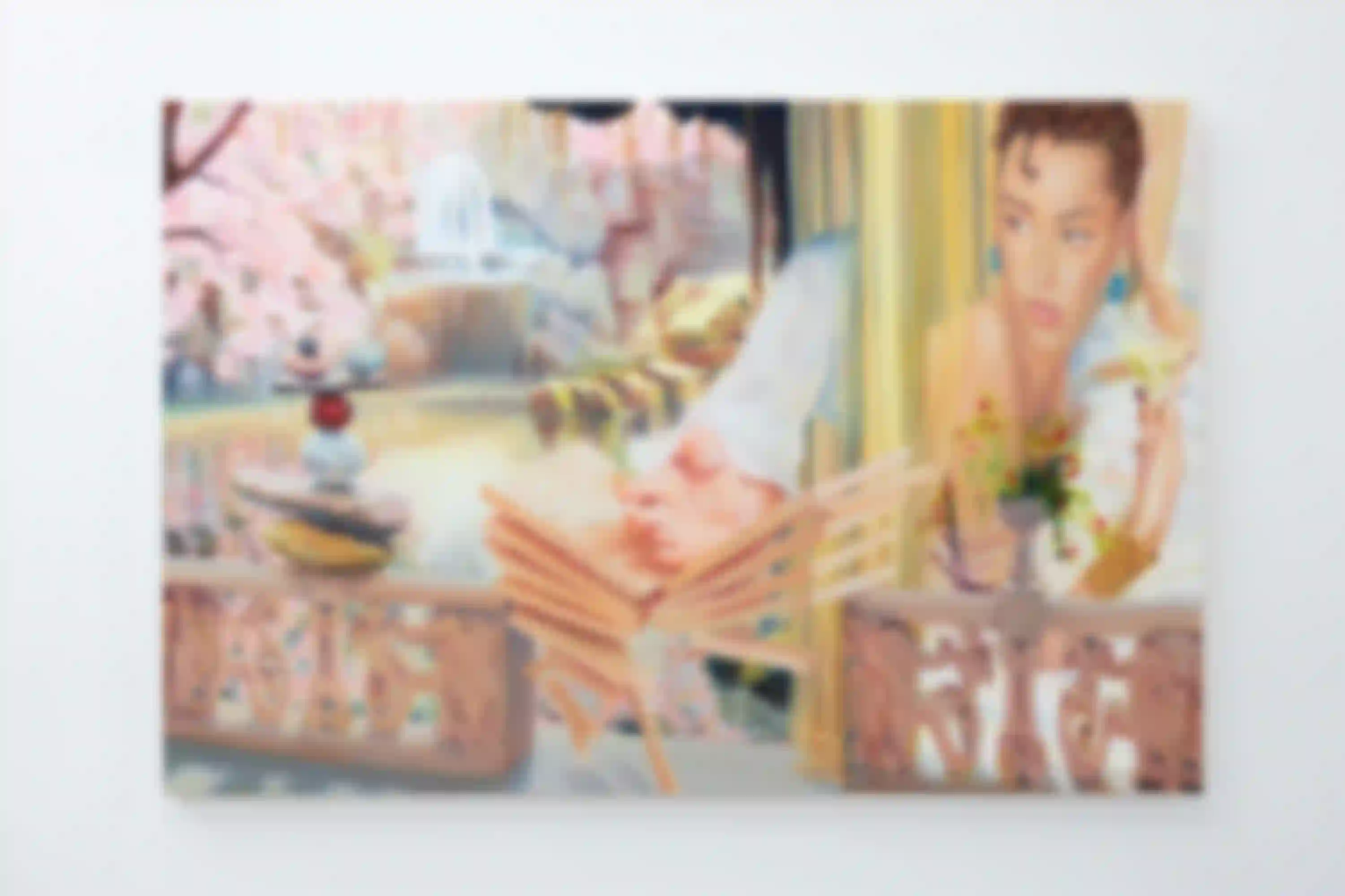 Leere Gläser, verwischt mit ihrem leicht dreckigen, kaugummirosa Hintergrund. Es entsteht glatt der Eindruck, es ließe sich noch eine verklungene Musik erahnen. Es ist unklar, ob die Gläser gerade geleert sind, oder darauf warten wieder gefüllt zu werden. Unklar, ob das Motiv auf eine vergangene oder zukünftige Temporalität verweist, woraus Gemma Sotos “Escena IV/ Reunión” eine ambivalente Spannung schafft. Auch der Titel, übersetzt “Szene IV/ Versammlung” lässt uns zweifeln, ob wir einen schwachen Moment der Nostalgie betrachten, oder die Spur einer zukünftigen Gemeinsamkeit. Es ließe sich vielleicht auch gleichsetzen mit einer alltäglichen, sich-sehnenden Zeit und den überschwänglichen Versuchen des Ausbruchs aus dieser.