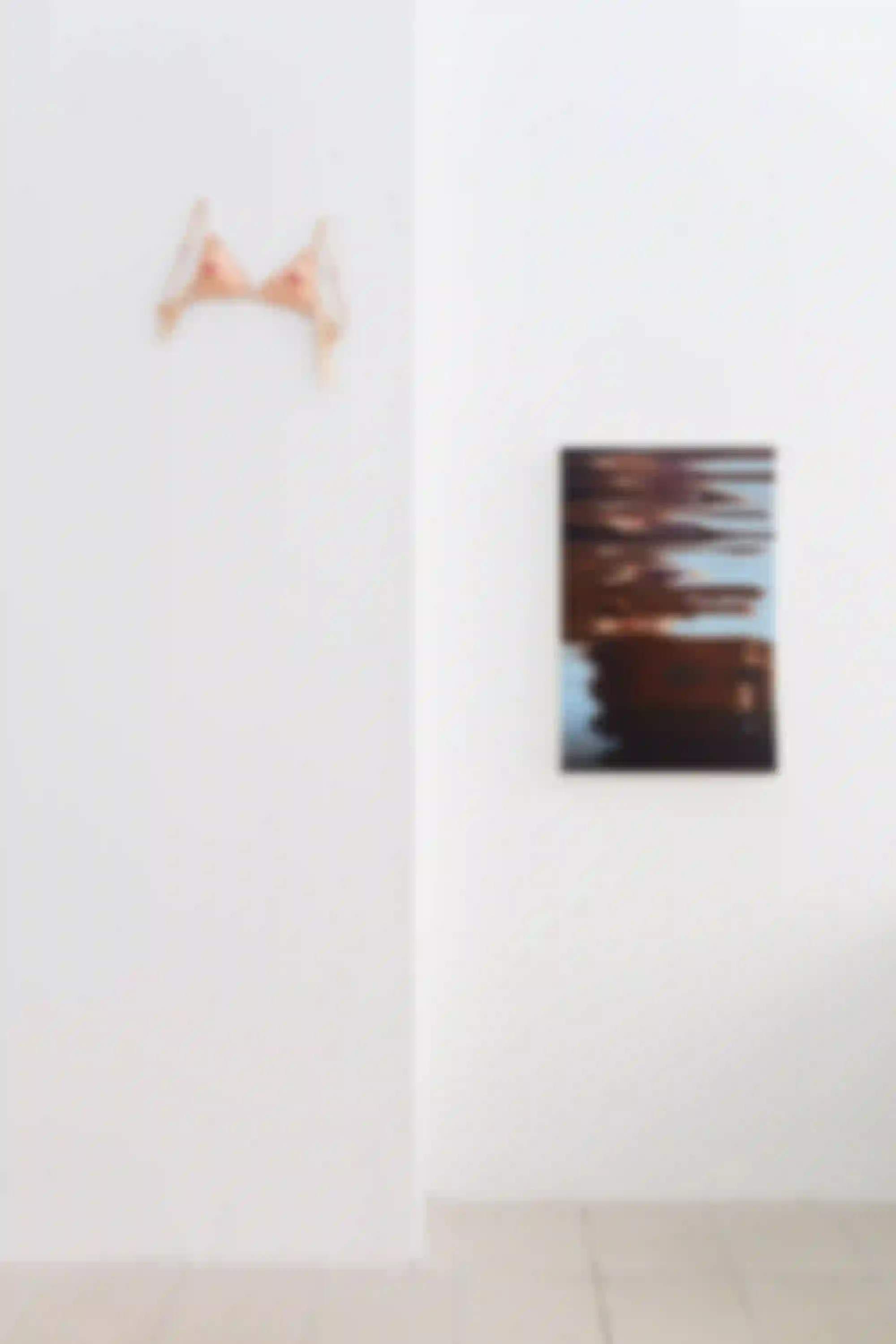 Diese Versuche des Ausbruchs sind in den verschiedenen Facetten der versammelten Werke zu finden. In Lubes Objekten, die mithilfe ihrer Lost&Found-Methodik die zugrunde liegende (Aus-)Sortierungslogik des Alltags beschwören, wird dies erkennbar. Ein Twist davon sind die Fotografien “”, in denen sie selbst ihre aussortierten Objekte inszeniert. Eggers und Thorday bespielen derzeit zwei Seiten einer Münze von Betrachtungen des Alltags. Thorday sieht das sakralisierte, beschleunigte Produkt noch in Schlieren, welches uns aus der Tristesse zu befreien verheißt, während Eggers die Auswirkungen dieser lähmenden Beziehung auf unsere Gehirne und Muskeln einfängt: das Figurative vollends verschwommen, in den wellengebrochenen Spiegelungen von “Utsuroi 7” (Tr.: “gradueller Wechsel (von Licht und Schatten)”).